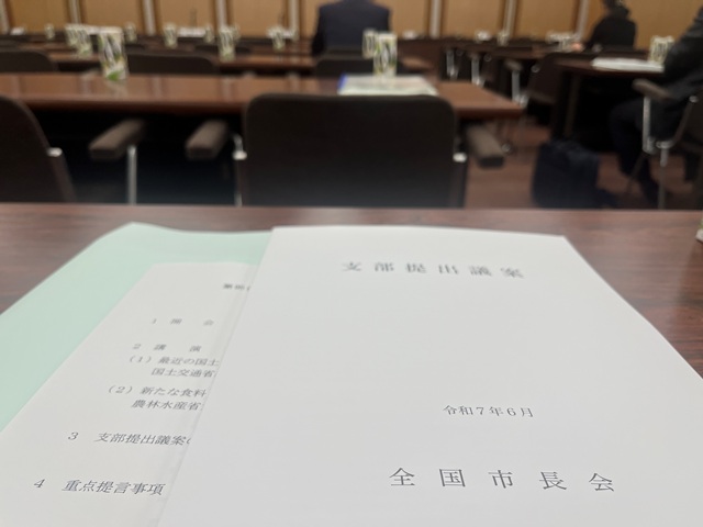 議案審議に先立って「最近の国土交通行政について」国土交通省の総合政策局長と、「新たな食料・農業・農村基本計画について」農林水産省大臣官房政策課参事官にご講演いただきました。その後、明日の全国市長会にむけての支部提出議案の審議、重点提言事項の審議と続きました。明日も引き続きよろしくお願いします。
