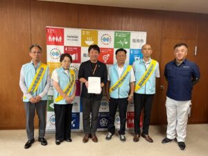 8月は電気をよく使う月、電気使用安全月間ということで大阪府電気工事工業組合の皆さんが趣意書を届けに来られました。
