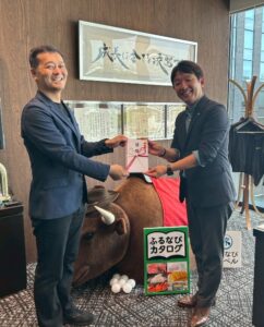 こちらは田中会長と。後ろに写っているのは貴乃花関が乗っていた噂のロデオです。この度株式会社アイモバイル様から企業版ふるさと納税のご協力をいただきまして、そのお礼と感謝状の贈呈のために訪問させていただきました。この度はありがとうございました。これからもよろしくお願いいたします。
