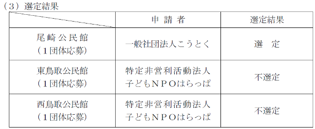 もう一つその他案件がございまして、今年5月から令和8年度からの公民館3か所の新たな指定管理事業者を決めるための手続きをしておりましたが、尾崎公民館1か所は決まりましたが、あとの2か所は不選定となりました。