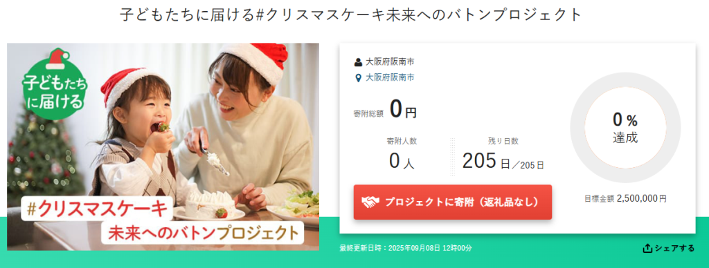 クリスマスに笑顔を届けたい、ケーキで子どもたちの記憶に残る一日を!ということで、寄付いただいた方にはふるさと納税の返礼品はありません(税額控除はあります)が、阪南市のひとり親家庭の子ども達に、笑顔と心あたたまるクリスマスケーキを届けさせていただきます。