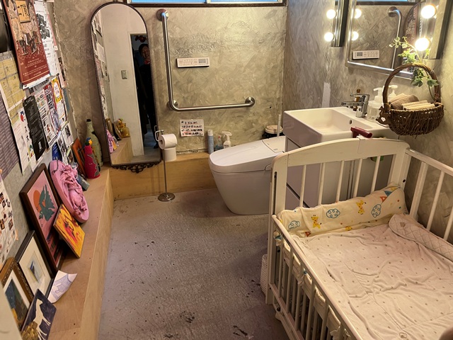 この写真はトイレですがベビーベッドや姿見があってホスピタリティ溢れるオシャレ空間になっています。