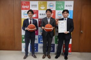 そして午後からはアイランドホーム様がお越しいただき、阪南市の中学生にバスケットボールのご寄付をいただきました。