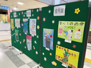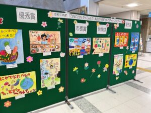 市役所玄関では令和7年度「できることからやってみよう!食品ロス削減ポスター」コンクールの掲示をしています。