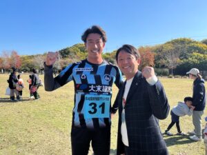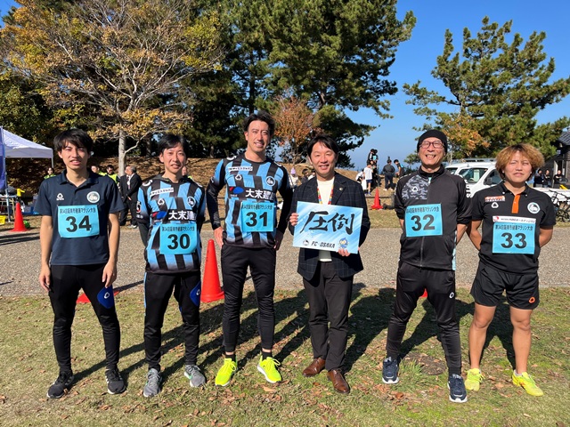 FC大阪さん、たくさんでご参加いただいておりました。マラソン大会を盛り上げていただきましてありがとうございます。FC大阪さんはいよいよJ2に昇格をねらい、勝負のプレーオフが始まります。阪南市と包括連携協定を結ぶFC大阪さんです。皆様の応援をよろしくお願いします。
