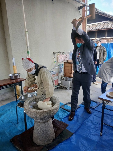 今シーズン初お餅つき。「お!市長、構えがええな!剣道でもやってたんか?」「昔ちょっとだけやってましたー!」って感じで頑張りました。
