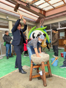 毎月行っている舞っ子食堂の一環で餅つき大会です。はなてぃも特別参加。