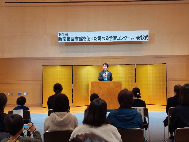 本日は第1回阪南市図書館を使った調べる学習コンクール表彰式が開催され、来賓参加いたしました。このコンクールは今年から始まったコンクールで、9月に募集された小学生の部・中学生の部・大人の部のそれぞれの優秀賞などが選ばれる中、阪南市長賞を選ばせてもらいました。