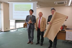 私が持っているのが山糸、日本製紙パピリア(株)さんがお持ちいただいているのが「山糸の布」、そして真ん中の和紙の布社長の阿部社長が着ているのが「山糸のジャケット」です。