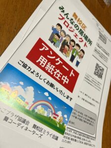 皆さんのもとにこのような用紙、「舞校区みんなの居場所プロジェクト」アンケートが届いていると思います。ぜひご協力いただきまして、よりよい地域を共に創りましょう。