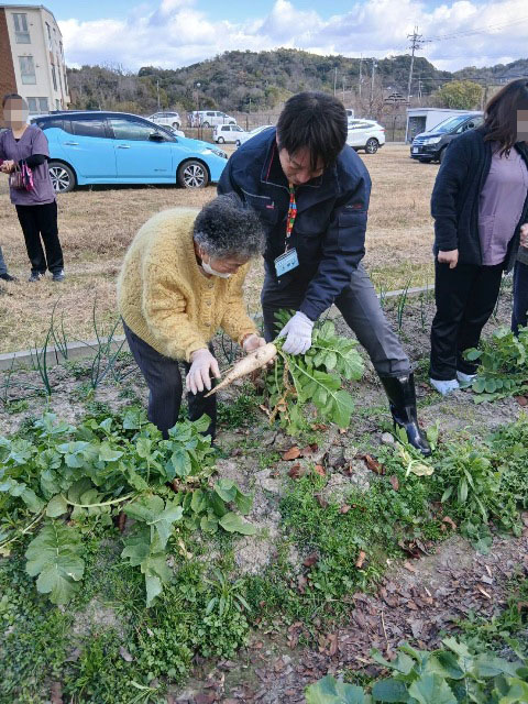 大根は昨年、グリーンサポーターの皆さんが畝を作って種まきをしてれたもので、今回も3人のグリーンサポーターメンバーがデイサービスの利用者の皆さんの手を優しく引きながら「大根抜き」のお手伝いをしてくれました。