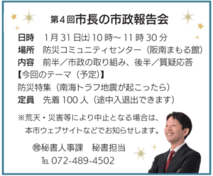 明日、31日、土曜日の10時~11時30分で第4回阪南市長の市政報告会(3か月に1回開催しています)を行います。