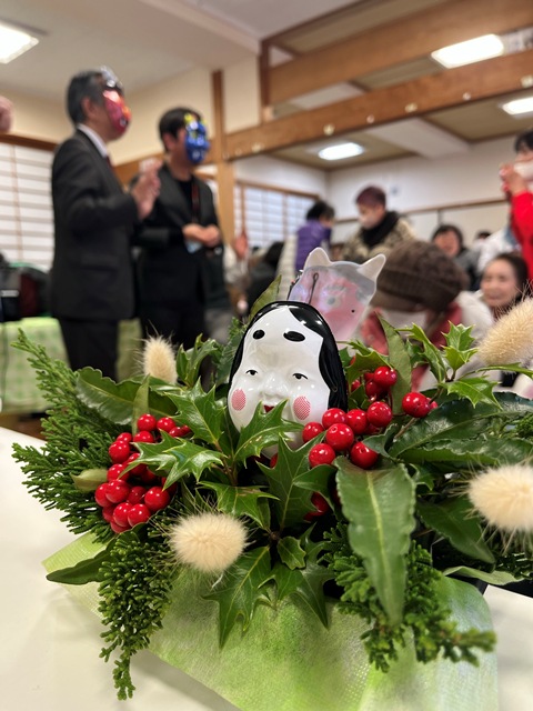 その後、昨年と同様に、2月ということで私も二神議員も役員の皆さんも鬼のお面を付けさせていただいて「豆まき」。福豆もたくさんいただきました。
