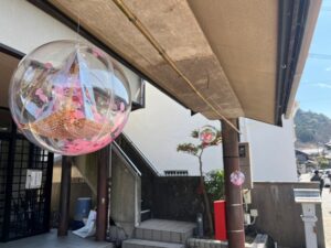 山中渓ゆらめくアートさんぽとして歴史街道の建物の軒先にシャボン玉のようなアート展示がたくさん設置してあります。