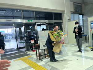 引き続き阪南市役所内でもこれまでの功労表彰に引き続き、辞令を交付させていただきました。退職される皆様におかれましては、これまで阪南市の市政運営にご尽力いただきましたことに心から敬意と感謝を表します。今後も阪南市に関わっていただける方については引き続きよろしくお願いいたします。離れていかれる方も、今後とも阪南市の応援をよろしくお願いします。それ以外にも明日から派遣させていただく方、派遣を解く方にも辞令を交付させていただきました。そして夕方、、、
