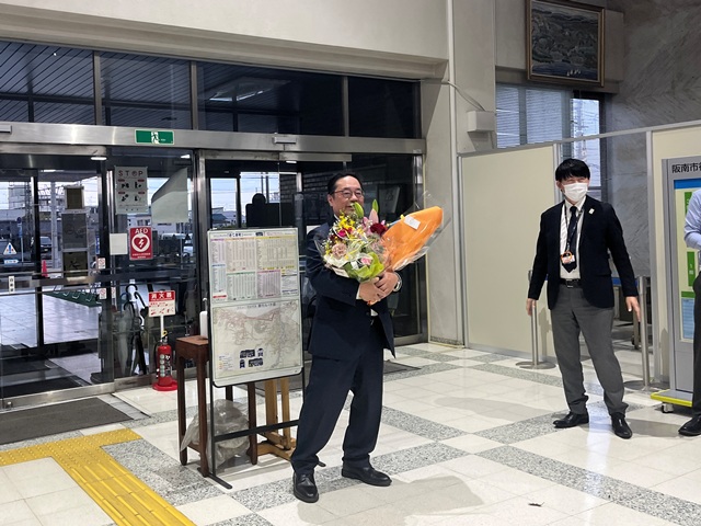 引き続き阪南市役所内でもこれまでの功労表彰に引き続き、辞令を交付させていただきました。退職される皆様におかれましては、これまで阪南市の市政運営にご尽力いただきましたことに心から敬意と感謝を表します。今後も阪南市に関わっていただける方については引き続きよろしくお願いいたします。離れていかれる方も、今後とも阪南市の応援をよろしくお願いします。それ以外にも明日から派遣させていただく方、派遣を解く方にも辞令を交付させていただきました。そして夕方、、、