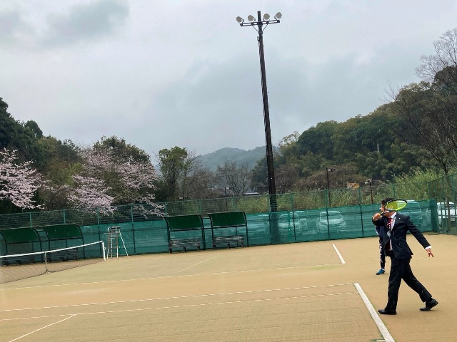 辞令交付のあと、少し小雨がぱらついておりましたが、桑畑の市立テニスコートの人工芝の貼替工事が終了したとのことで、阪南市テニス連盟の皆さんにお招きいただき、こけら落としセレモニーに参加させていただきました。