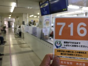 まず、市役所に入って右側に進んでいただくと、手続きの用紙がありますので、そこで所定の用紙に記入いただきます。(これはいつも通り。わからない時は近くに職員さんがいると思いますので聞いてください)