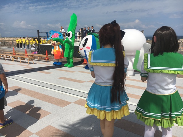 ゆるキャラたちも。手前からざっくぅ(Jコムさん)、はなてぃ(阪南市)、アマモン(アマモ)、みさっきー(岬町)です。アマモンは海草のアマモをモチーフにしたアマモ場再生会議マスコットキャラクターで、アマモ場の再生に積極的に取り組んでいるそうです。今日のためにわざわざ関東から来てくれました。来年は阪南市で第11回全国アマモサミットが開催されます。子ども達はアマモンを見て「なーにー?きゅうり?ネギ?」などと自由な発想でした。